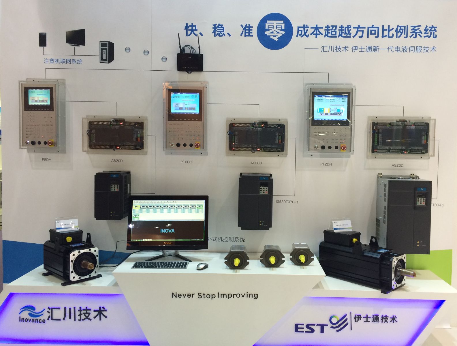 此次展會最大的亮點(diǎn)是匯川技術(shù)聯(lián)合伊士通推出新一代電液伺服技術(shù):“快、準(zhǔn)、穩(wěn)”零成本超越方向比例系統(tǒng)。匯川技術(shù)和伊士通通力合作,借助匯川技術(shù)在意大利米蘭的研發(fā)中心,研發(fā)推出INOVA系列注塑機(jī)電腦,此控制系統(tǒng)實(shí)現(xiàn)了與匯川新一代伺服產(chǎn)品的無縫對接,節(jié)省了傳統(tǒng)系統(tǒng)中的方向比例閥,極大的節(jié)省了客戶成本。目前此系統(tǒng)已得到行業(yè)內(nèi)眾多高端客戶的認(rèn)可與使用。